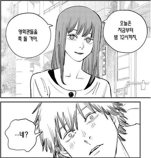 이 마키마가 뜬금없이 덴지와 데이트를 하자고 한다. 하루 왠종일 영화나 보러 가자. 뭔 영화요? 뭔 영화는 뭔 영화여 그냥 있는 대로 다 볼 것이여. 하고 진짜 하루 종일 덴지랑 영화를 보는데 이 장면은 왜 있는 거지?