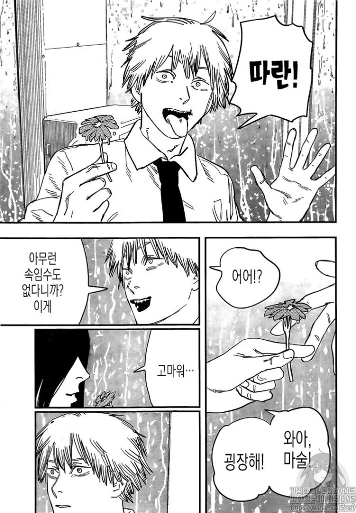 여기서 이 여자가 덴지의 얼굴을 보고 죽은개와 닮았다느니 어쩌느니 드립을 치자 덴지가 꽃을 뱉으면서 마술을 보여준다. 이것도 뭐 악마들의 능력인가? 목구멍에 넘긴걸 어떻게 온전하게 꺼내지…?