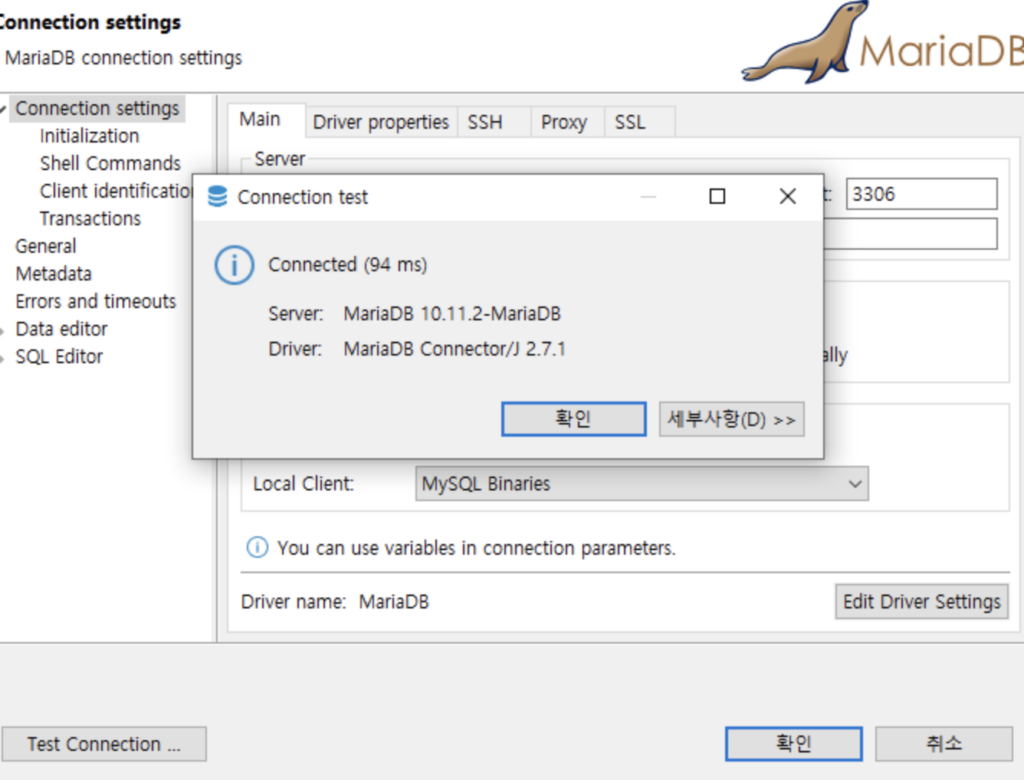입력 후 Test Connection 버튼 클릭.