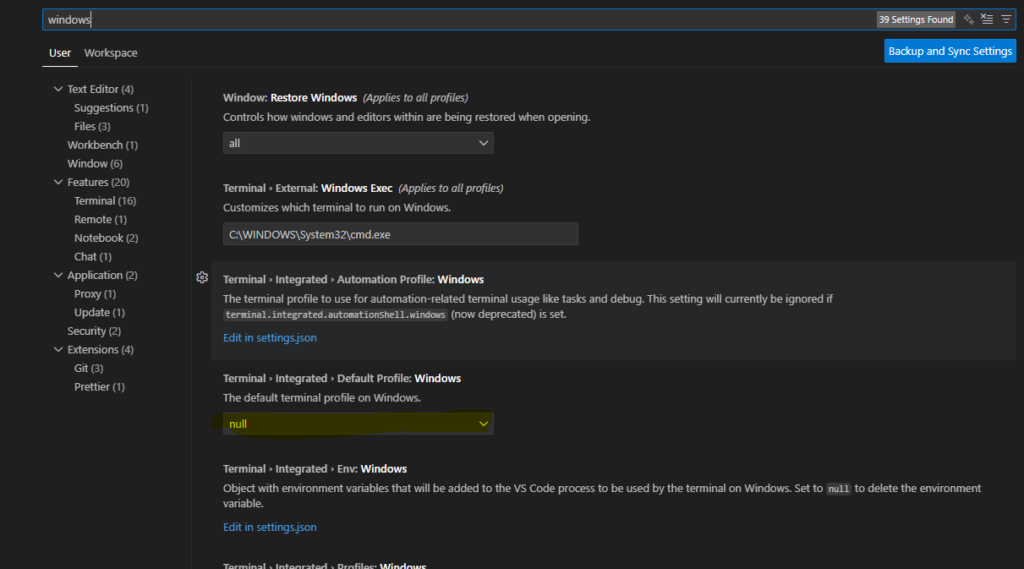 아래 Terminal Integrated Default ProFile: Windows 탭으로 간다. null로 되어있다.